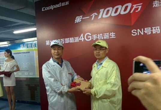 5月24日中午12點半左右,酷派東莞工廠廠長葛總親手將包裝上紫色彩帶的第1000萬部酷派4G手機交給了酷派集團副總裁曹井升,并由后者將這部手機的SN碼填寫在簽名背板上,以為對照。