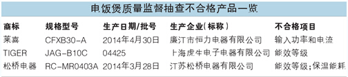結(jié)果顯示,在不合格批次產(chǎn)品中,TIGER和松橋電器產(chǎn)品的不合格項(xiàng)目為能效等級(jí)和保溫能耗。事實(shí)上,這類能效虛標(biāo)問題在家電行業(yè)并不少見,尤其是空調(diào)、冰箱等產(chǎn)品領(lǐng)域,企業(yè)往往希望借助高能效等級(jí)來進(jìn)行促銷。而萊喜型號(hào)為GFXB30-A的電飯煲則被檢查存在嚴(yán)重的質(zhì)量問題,原因是產(chǎn)品輸入功率和電流不合格。