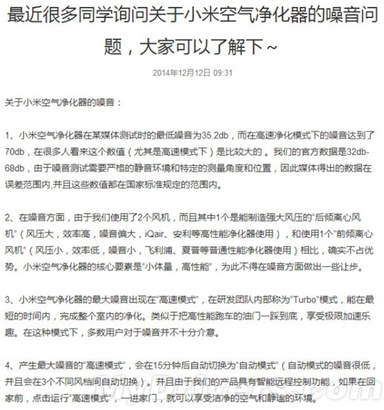 以下為智米對小米空氣凈化器噪音問題的說明全文: