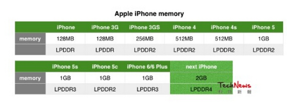 臺灣媒體Technews近日報道稱,蘋果iPhone 6S(暫且這樣命名)將配備 2GB LPDDR4 內存,這是繼iPhone 5內存加大到1GB后,蘋果首次對iPhone內存做出的調整,目前iPhone 6和 iPhone 6 Plus均采用的是1GB LPDDR3內存。