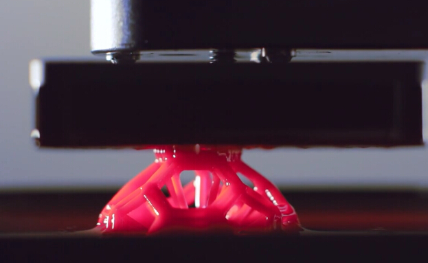 現有的3D打印工藝使用液態樹脂,在一個緩慢的過程中逐層打制作出物品:先打印一層,固化它,補充樹脂材料,然后再打印一層,周而復始,直到打印完成。而在CLIP工藝中,一個投影機從下方用紫外線顯示連續的、極薄的物品橫截面。紫外線在一缸液態樹脂中以橫截面方式硬化液體。與此同時,一臺升降機不斷將成形的物體撈出樹脂缸。