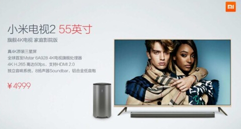55英寸版小米電視2采用MStar 6A928處理器,Mali-760圖形處理器,2GB運行內(nèi)存和8GB存儲空間,三星4K液晶屏及瑞儀背光模組,牌照合作方則為銀河電視。售價(含Soundbar、無線低音炮)4999元,將于4月8日米粉節(jié)當天在小米網(wǎng)免預約開放購買