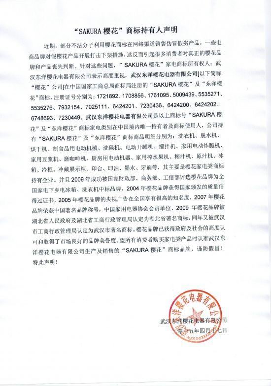 李杰也向記者出示了相關商標注冊證書。“我們公司才是‘SAKURA櫻花’及‘東洋櫻花’商標家電類別在中國境內唯一持有者及商標使用人”,李杰強調到,公司目前經營的產品范圍有洗衣機、脫水機、烘干機、制食品用電動機械、洗碟機、電動開罐機、攪拌機、家用電動炸脆機、家用豆漿機、磨咖啡機、廚房用電動機器、家用榨水果機、榨汁機、原汁機、冰箱、冷柜、冷藏展示柜、印臺、印油、墨水、牙刷等。