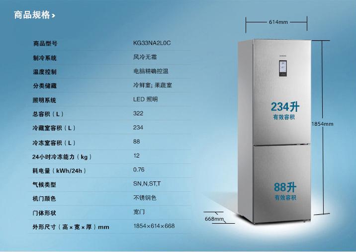 西門子KG33NA2L0C冰箱擁有322升有效容積,其中,冷藏室容積為234升,冷凍室容積為88升。超大容量可滿足家庭日常生活的全部儲藏需求,實惠又實用。而能耗方面,冰箱屬于國家一級能耗產品,耗電量僅為每天0.76千瓦時,節能低耗,為您開啟經濟綠色生活。
