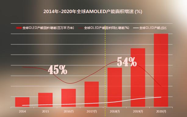 其次,投資旺盛。”李亞琴說,以全球六代和六代以下線的手機面板產能看,AMOLED到2018年的占比大約達到40%,2020年接近50%的占 比。考慮到良率等因素,OLED的出貨量占比會略低一些,預計2020年在6代和6代以下線的手機面板出貨量中占比到40%~45%之間。