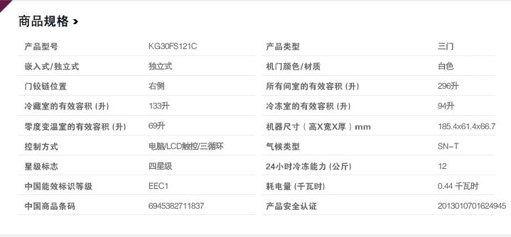 西門子KG30FS121C冰箱總有效容積為296升,其中冷藏室為133升,零度變溫室為69升,冷凍室為94升。總體看來,整體內(nèi)部空間深度從540mm增加至565mm,且優(yōu)化的保溫層等經(jīng)過特別設(shè)計(jì),讓內(nèi)部空間極大釋放,容積更大,享受更多鮮美。