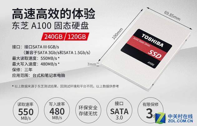 東芝A100系列定位于中端入門級固態硬盤。7mm纖薄厚度,基于SATA 6Gbps接口、低功耗15nm eTLC原廠顆粒以及原廠TC58NC1010新主控。其持續讀取速率可達550MB/s,持續寫入速率也可達480MB/s,性能已躋身一流行列。