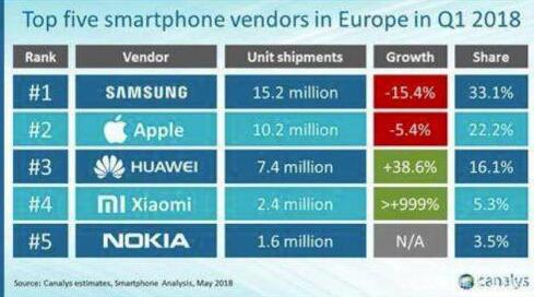 根據國外市場研究機構Canalys發布的《2018年第一季度歐洲智能手機市場出貨量報告》顯示,第一季度,歐洲市場排名前五的廠商為三星、蘋果、華為、小米和諾基亞。其中華為智能手機和小米在歐洲市場出貨量同均有大幅增長。