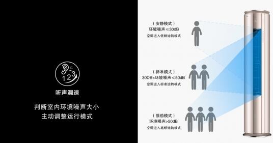 長虹CHiQ空調Q5Ds、Q5Gs系列AI人工智能空調通過創新的“聲紋感控”技術,具備“識人”能力,根據聲量判斷室內噪聲大小,主動調整運行模式。在環境噪聲≤30分貝時,空調自動進入低頻運轉模式;在環境噪聲在30-50分貝之間時,自動進入標準運轉模式;在環境噪聲≥50分貝時,自動進入高頻運轉模式,滿足不同場景所需。