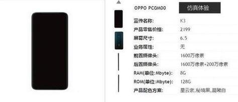 日前,中國(guó)電信天翼網(wǎng)站曝光了OPPO K3的信息,從頁(yè)面參數(shù)來看,OPPO K3采用了6.5英寸全面屏,前置1600萬(wàn)像素攝像頭,后置1600萬(wàn)+200萬(wàn)像素?cái)z像頭,擁有星云紫、秘境黑、晨曦白三款配色。曝光的版本是8GB+128GB的版本,售價(jià)為2199元。預(yù)計(jì)還有6GB+128GB的版本,售價(jià)或?yàn)?999元,。