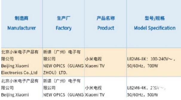據了解,這兩款小米新電視均配備82英寸屏幕,由新浦(廣州)電子有限公司代工。