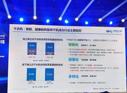 雖然洗衣機市場的整體下滑,但干衣機品類在今年呈現出逆勢增長的態勢,成為白電市場最大的黑馬。奧維云網數據顯示,2020年1-9月干衣機市場零售額規模18.1億元,同比增長45.3%,其中線上市場零售額7.2億元,同比增長43.8%,線下市場零售額11.0億元,同比增長46.3%。更加智能、健康的熱泵式干衣機已成為行業的主要發展趨勢,2020年1-9月,熱泵式干衣機在獨立式干衣機線上零售額中的占比從去年同期的50.4%增至74.1%,獨立式干衣機在線下零售額的占比也從去年同期的94.0%進一步擴大至97.2%。