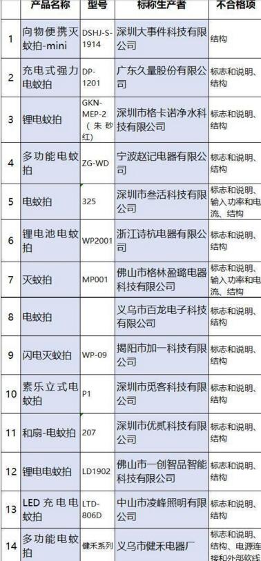 抽檢結果出人意料,被抽檢的14批電蚊拍產品均不合格,不合格率100.0%。其中不合格項目包括,標記和描述,輸入功率和電流,電源連接和外軟線等。