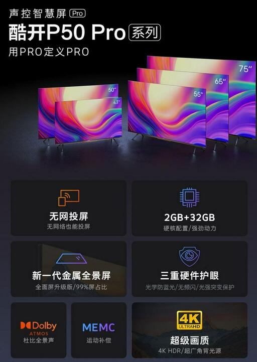 酷開表示,新款酷開P50 Pro系列與舊款酷開P50系列相比,在屏占比、護眼、聲畫效果上均有所提升——酷開P50 Pro系列新品電視屏占比99%,配備AI畫質調校、178度廣視角背光源等畫質技術,支持光學防藍光、無頻閃、光強突變保護三重硬件護眼,并搭載杜比全景聲。