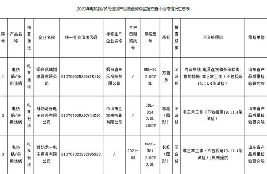 本次抽查發現煙臺貳陸捌電器有限公司(標稱生產企業:煙臺喜來樂商貿有限公司)、濰坊禾一電子商務有限公司(標稱生產企業:長虹美菱日電科技有限公司)、濰坊奇好電子商務有限公司(標稱生產企業:中山市金寶來電器有限公司)3家銷售者的3批次產品不符合相關標準的要求,不合格項目為非正常工作、機械強度、內部布線、電源連接和外部軟線、接地措施等。