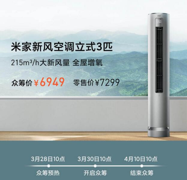 3月28日消息,小米現(xiàn)推出了一款米家新風(fēng)空調(diào)立式3匹,將于3月30日開啟眾籌,眾籌價(jià)6949元,原價(jià)7299元。