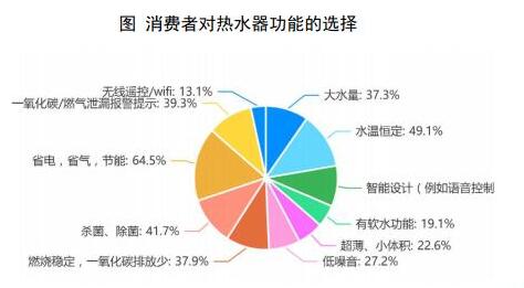 為了消費者能夠更加清晰地了解當下的熱水器產品,《報告》也從產品特點與主流技術方面做了總結。在調研中我們發現,人們對熱水器功能選擇方面的有很多具體的標簽。在15個選項中,排名第一的選項是“省電省氣節能”,這也從另一個側面印證了人們對綠色消費的訴求。值得一提的是,“殺菌除菌”功能是被調查者認為熱水器最重要的三項功能之一。另外,針對消費者關心的安全技術問題,各生產廠家也在不斷提升產品的安全性能。推出了如“防電墻”、“零電洗”等技術,實時監控電路,保障消費者的使用安全。
