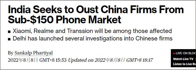 彭博社8月8日援引消息稱,印度為扶植本地企業,正試圖限制中國智能手機制造商在印銷售價格低于1.2萬盧比(約合1000元人民幣)的手機。報道稱,如若成真,或對部分中國品牌的在印經營造成打擊。