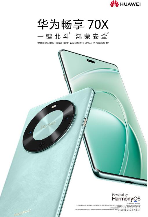 宣傳海報展示了華為暢享70X手機的外觀,其機身背部搭載奧利奧鏡頭,機身正面搭載雙曲面屏幕。此外,宣傳海報還顯示,華為暢享70X手機搭載華為巨鯨長續(xù)航電池、支持五星超耐摔、支持北斗衛(wèi)星消息、5000萬RYYB暗光影像。