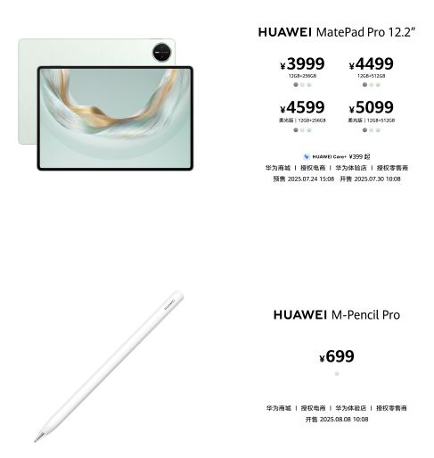 即日起,HUAWEI MatePad Pro 12.2 英寸將在華為商城、授權電商、華為體驗店以及授權零售商等平臺全面開啟預售,7月30日正式開售,其中12GB+256GB版3999元、12GB+512GB版4499元、12GB+256GB柔光版4599元、12GB+512GB柔光版5099元,購機還可領取價值1000+元鴻蒙有禮權益禮包。配件方面,HUAWEI M-Pencil Pro售價699元,8月8日正式開售,華為星躍鍵盤售價1099元,現已開售,支持用戶單獨選購。