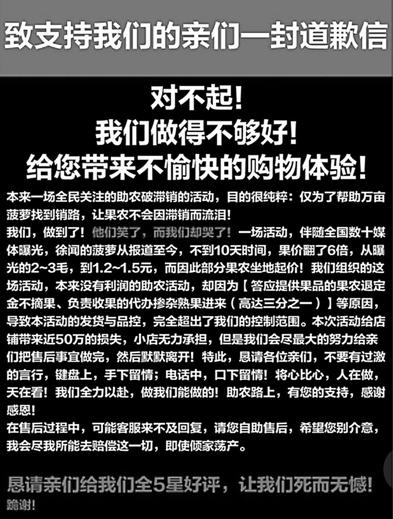 5月16日,一家叫做“笨鮮生”的天貓旗艦店貼出一封致顧客的道歉信。信中稱,我們組織的這場本來沒有利潤的助農活動,卻因為答應提供果品的果農退定金不摘果、負責收果的代辦摻雜熟果進來(高達三分之一)等原因,導致本活動的發貨與品控,完全超出了我們的控制范圍。店家還表示,活動給店鋪帶來無力承擔的近50萬損失,該店承諾壞果包賠,會做好售后工作,“然后默默離開”。同時,店家還表示“已經著手起訴部分果農”。