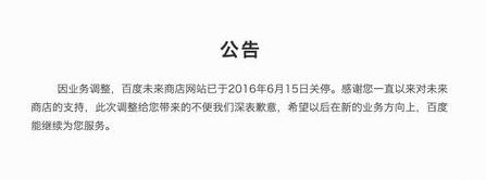 6月17日上午消息,百度未來商店于近日正式關停,目前打開頁面僅剩下關停公告。這也意味著上線于 2015 年 3 月的百度未來商店,在運營一年之后走到了盡頭。此前,百度還下線了健康醫藥館等。