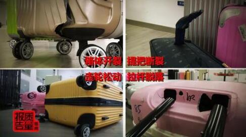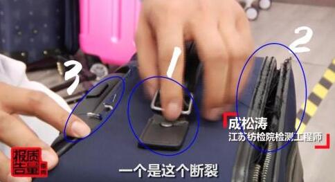 提把、拉桿結不結實,直接影響箱包正常使用。但是問題最多的恰恰就是這兩個部位的檢測。71批次不合格,53批次就出在了提把和拉桿的牢固度上,這些提把,都在檢測中斷裂。其它問題比如箱體變形破損、走輪連接松動,也出現一定比例的不合格批次。