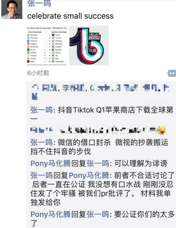 5月8日消息,今日凌晨張一鳴在朋友圈發文,慶祝抖音國際版“Tiktok”2018第一季度在蘋果商店下載全球第一,并在評論區劍指騰訊,表示“微信的借口封殺,微視的抄襲搬運擋不住抖音的步伐”。對此,馬化騰在評論區直接開懟,認為張的表態“可以理解為誹謗”。