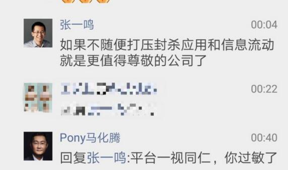 隨后,張一鳴又在朋友圈表示:“如果(騰訊)不隨便打壓封殺應用和信息流動,就是更值得尊敬的公司了。”馬化騰則直言張一鳴“過敏了”,并放話“平臺一視同仁”。