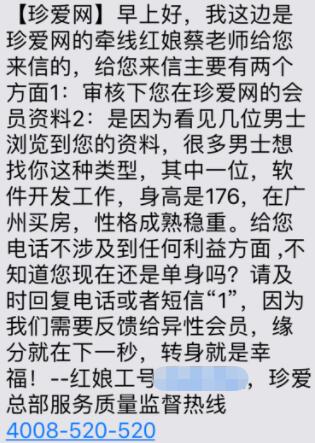 今年2月,阿琪(化名)偶然間在珍愛網上注冊了賬號,之后便遭到“紅娘”無休止地電話騷擾,稱珍愛網最近在舉行線下相親活動,有位優質男士對阿琪非常感興趣,希望她能來線下門店來做一下信息認證。