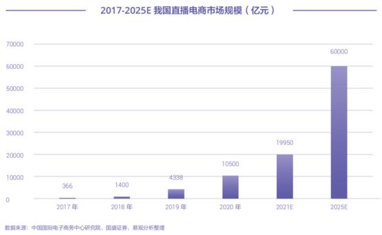根據商務部中國國際電子商務中心研究院發布的《2021年中國直播電商產業研究報告》顯示,2020年,我國直播帶貨整體規模突破1萬億元,2021年接近兩萬億元,至2025年,直播電商市場規模預計將達6萬億元,直播電商增速喜人。