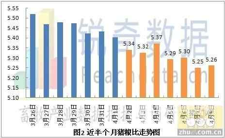 萬通商務(wù)網(wǎng)訊:據(jù)銳奇數(shù)據(jù)監(jiān)測(cè)的當(dāng)?shù)厣i報(bào)價(jià)信息統(tǒng)計(jì),2013年04月09日全國(guó)各省生豬平均價(jià)格為12.35元/千克,較昨日上漲0.02元/公斤,漲幅為0.16%,較上周同期(4月2日)下跌0.33元/千克,跌幅為2.60%,今日豬糧比為5.26:1,較昨日上漲0.01,漲幅為0.19%,較上周同期(4月2日)下跌0.14,跌幅為2.59%(見圖2)。