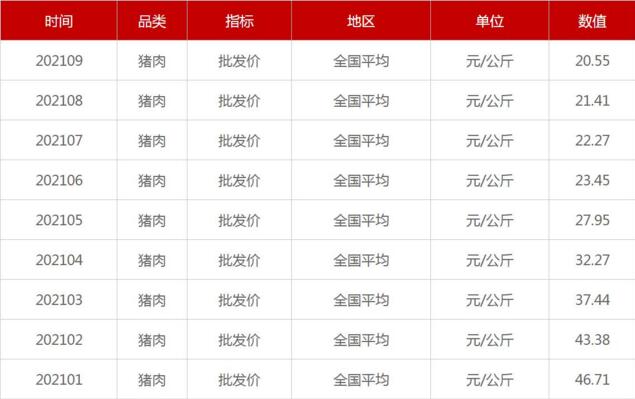 據(jù)農(nóng)業(yè)農(nóng)村部披露的農(nóng)產(chǎn)品批發(fā)價(jià)格數(shù)據(jù),全國平均豬肉批發(fā)價(jià)年內(nèi)逐月走低,從1月份的46.71元/公斤,跌至9月份的20.54元/公斤,區(qū)間累計(jì)降幅達(dá)56%。