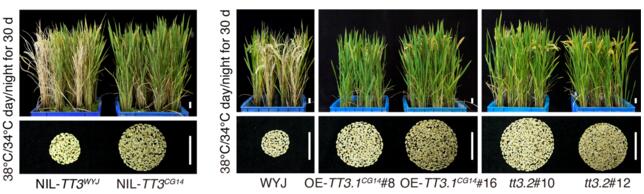 來自非洲栽培稻的TT3CG14位點及TT3.1過量表達、TT3.2敲除構建比對照顯著增加高溫脅迫下的水稻產量。