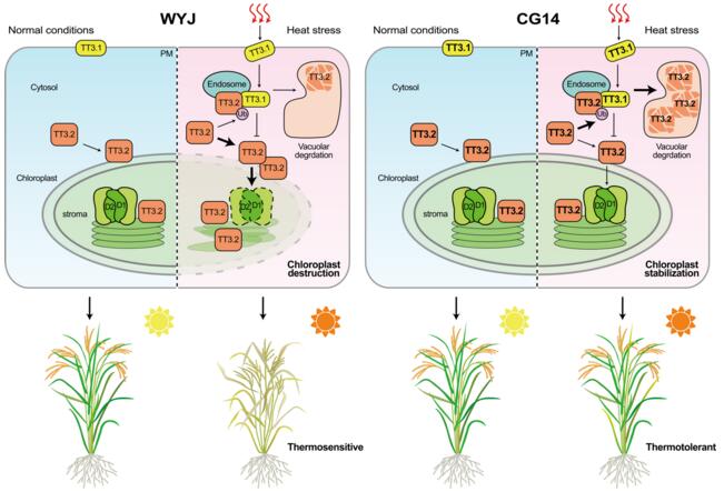 隨著全球氣候變暖趨勢的加劇,高溫脅迫成為制約世界糧食生產安全的最為主要的脅迫因子之一。據報道,平均氣溫每升高1℃,會造成水稻、小麥、玉米等糧食作物3%~8%左右的減產。因此挖掘高溫抗性基因資源、闡明高溫抗性分子機制以及培育抗高溫作物新品種成為當前亟待攻克的重大課題。研究團隊經過近十年的努力,終于成功分離克隆了水稻高溫抗性新基因位點TT3,并且闡明了其調控高溫抗性的新機制。這是研究團隊繼TT1和TT2之后,取得的又一重大進展。