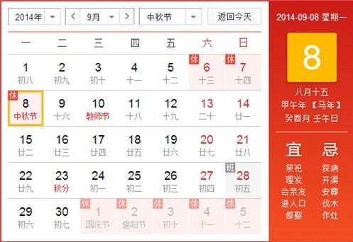 今日,北京市人民政府辦公廳發布了《關于2014年中秋節放假安排的通知》,今年中秋節休假三天,時間為9月6日至9月8日。期間機動車出行不受尾號限行限制。