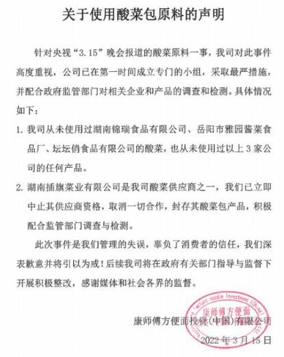 針對“3·15”晚會曝光的湖南插旗菜業(yè)“土坑酸菜”食品安全問題,16日凌晨,康師傅方便面投資(中國)有限公司發(fā)布聲明稱:湖南插旗菜業(yè)有限公司是我司酸菜供應商之一,已立即中止其供應商資格,取消一切合作,封存其酸菜包產(chǎn)品,積極配合監(jiān)管部門調(diào)查和檢測。