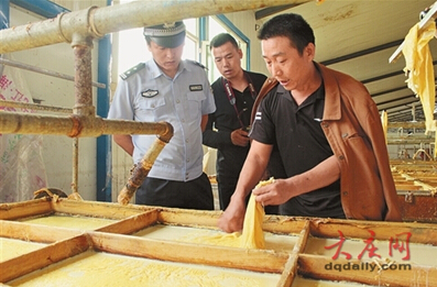 9月初,綜合連日蹲坑守候、秘密偵查和從周圍居民了解來的情況,市公安局治安支隊確定這是一處以大豆為原料生產腐竹、豆皮等食品的黑加工點,而且還存在使用有毒原料作為食品添加劑的情況。此外,該加工點的負責人李某、郭某都是河南人,在大慶周邊雇傭了不少工人,吃住都在工廠里。