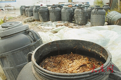 在工廠內,排列成“U”字形的廠房分為加工區、生活區和負責人的居所和化驗室。廠房中央的空地上,堆放著大量的黑色塑料桶,掀開塑料桶蓋,里面裝面了已成變成褐色的金針菇。