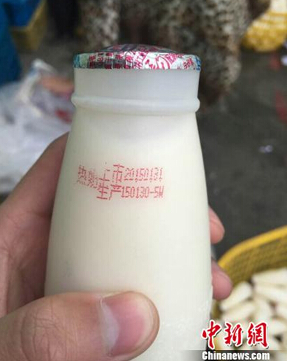 據工廠老板徐某交待,回收來的早餐奶,都是由運貨的駕駛員每天下午或者晚上送貨時帶回來的,一般都堆放在生產車間后門口。第二天早上,廠里的包裝女工用香蕉水擦拭掉瓶身上的原生產日期,然后放入熱水池用拖把清洗,同時又可以將這些早餐奶加熱。之后再放上流水線噴碼打印新的生產日期,當天處理好的這些回收早餐奶都會在當天再送貨銷售出去。“