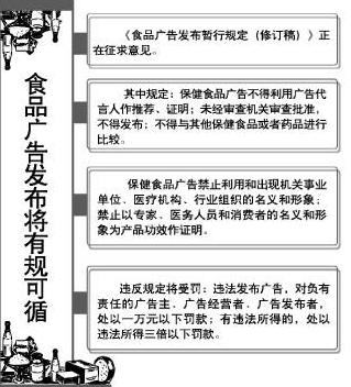 國家工商總局今天就廣告法8個配套部門規(guī)章向社會公開征求意見。值得注意的是,在《食品廣告發(fā)布暫行規(guī)定(修訂稿)》(征求意見稿)中,著重對保健食品廣告進行了明確規(guī)范,并詳細列舉了“不得利用廣告代言人作推薦、證明”等17類被禁止使用的內(nèi)容。