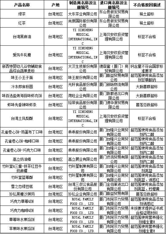 2016年4月28日,質檢總局公布2016年3月進境不合格食品信息,有146批食品在入境口岸檢驗檢疫機構實施檢驗檢疫時被發現不合格。值得關注的是,其中共有46批次不合格食品來自臺灣地區,約占不合格進境食品總數的31.5%。