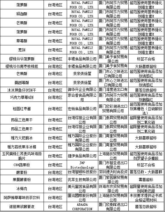 在此次抽檢中,超范圍使用食品添加劑再次成為臺灣進口食品不合格的主要原因。如3批產自乖乖股份有限公司的孔雀卷心餅檢出超范圍使用食品添加劑丙二醇、8批產自ROYAL FAMILY FOOD公司的糕點小食檢出超范圍使用營養強化劑維生素E、2批產自臺灣綜麗企業有限公司的即品三色果干檢出超限量使用食品添加劑二氧化硫等。