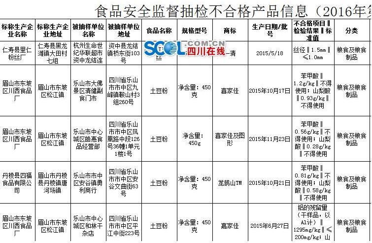 5月18日,四川在線眉山頻道記者從四川省食食品藥品監(jiān)督管理局獲悉,省食品藥品監(jiān)督管理局日前公布了全省今年第七批食品安全監(jiān)督抽檢信息。此次共抽檢了蜂產(chǎn)品、罐頭、糧食及糧食制品、餐飲食品、酒類等5類食品1603批次樣品,不合格樣品110批次。其中眉山共有3家企業(yè)生產(chǎn)的7批次產(chǎn)品不合格。