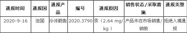 據歐盟食品和飼料快速預警系統(RASFF)消息,2020年9月16日,法國通過RASFF通報來自莫桑比克的冷凍箭魚不合格。具體通報內容如下: