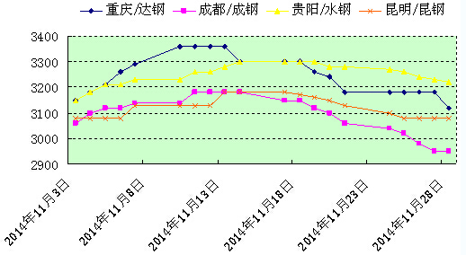 從11月西南地區建材走勢來看,商家盼漲心態急切,但底氣不足,因此上月行情經歷了大漲大落,如下圖是統計的11月西南地區主流螺紋價格走勢圖: