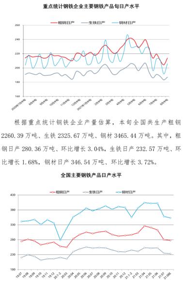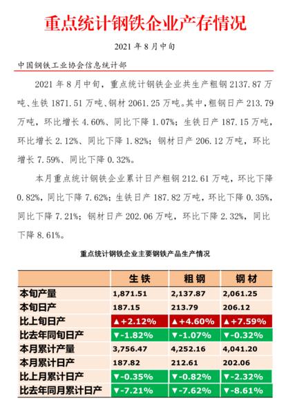 據中鋼協最新數據顯示,8月中旬,重點鋼企粗鋼日均產量213.79萬噸,環比增長4.60%、同比下降1.07%;鋼材庫存量1493.42萬噸,比上一旬增加31.22萬噸,增長2.13%。