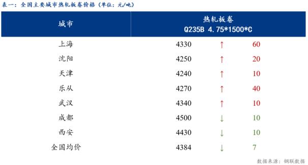 截止發(fā)稿時(shí)3.0mm熱軋板卷全國均價(jià)4455元/噸,較上個(gè)交易日下跌6元/噸。4.75mm熱軋板卷全國均價(jià)4384元/噸,較上個(gè)交易日下跌7元/噸。其中主要城市價(jià)格為上海4330元/噸,沈陽4250元/噸,天津4240元/噸,樂從4270元/噸,武漢4340元/噸,成都4500元/噸,西安4430元/噸。
