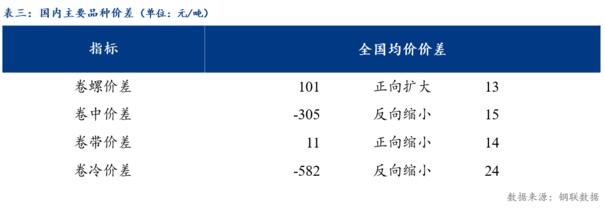 從品種價(jià)差來看,卷螺差較上一交易日擴(kuò)大13元/噸,熱中價(jià)差較上一交易日反向縮小15元/噸,熱帶價(jià)差較上一交易日縮小14元/噸,熱冷價(jià)差較上一交易日反向縮小24元/噸。