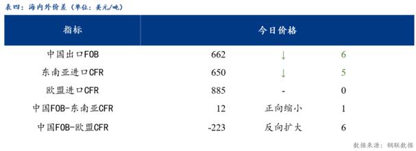 從區(qū)域價(jià)差來看,華東與東北價(jià)差80元/噸,較上一交易日擴(kuò)大40元/噸;華東與華南價(jià)差60元/噸,較上一交易日擴(kuò)大20元/噸;華南與華北價(jià)差30元/噸,較上一交易日擴(kuò)大30元/噸。